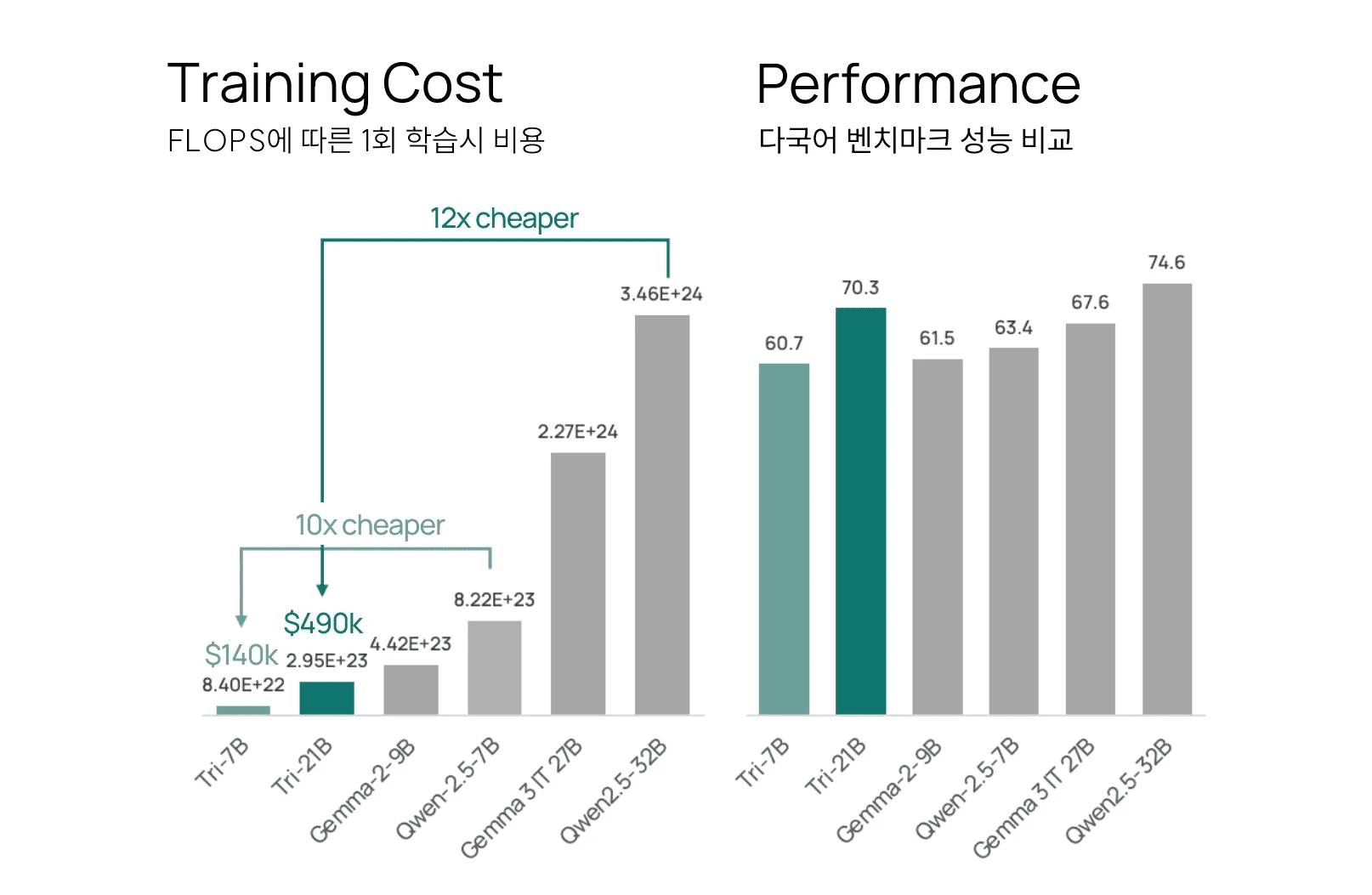 Tri-7B는 1회 학습에 $140K (약 2억), Tri-21B 는 1회 학습에 $490K (약 7억) 으로, 다른 오픈 소스 모델 대비 최대 10~12배 저렴한 비용으로 동일 성능의 모델 구현하였습니다.