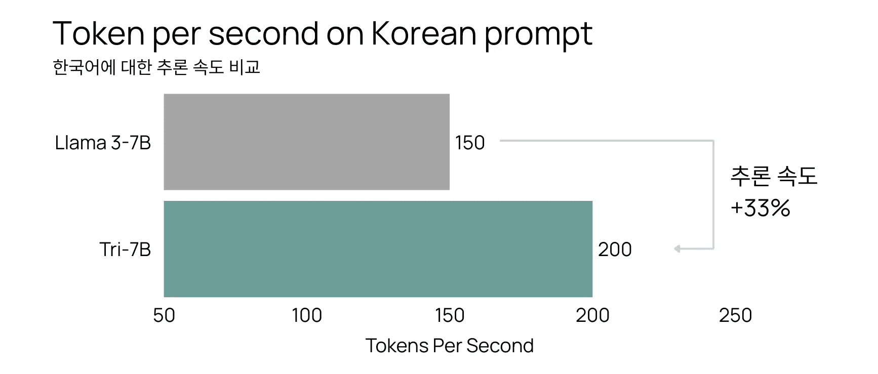 한국어 프롬프트에서 Llama 3-7B 대비 Tri-7B의 토큰당 초 추론 속도 비교하였을 댸, Tri-7B가 200 TPS 로 Llama 3-7B(150 TPS)보다 33% 더 빠른 속도를 보였습니다.
