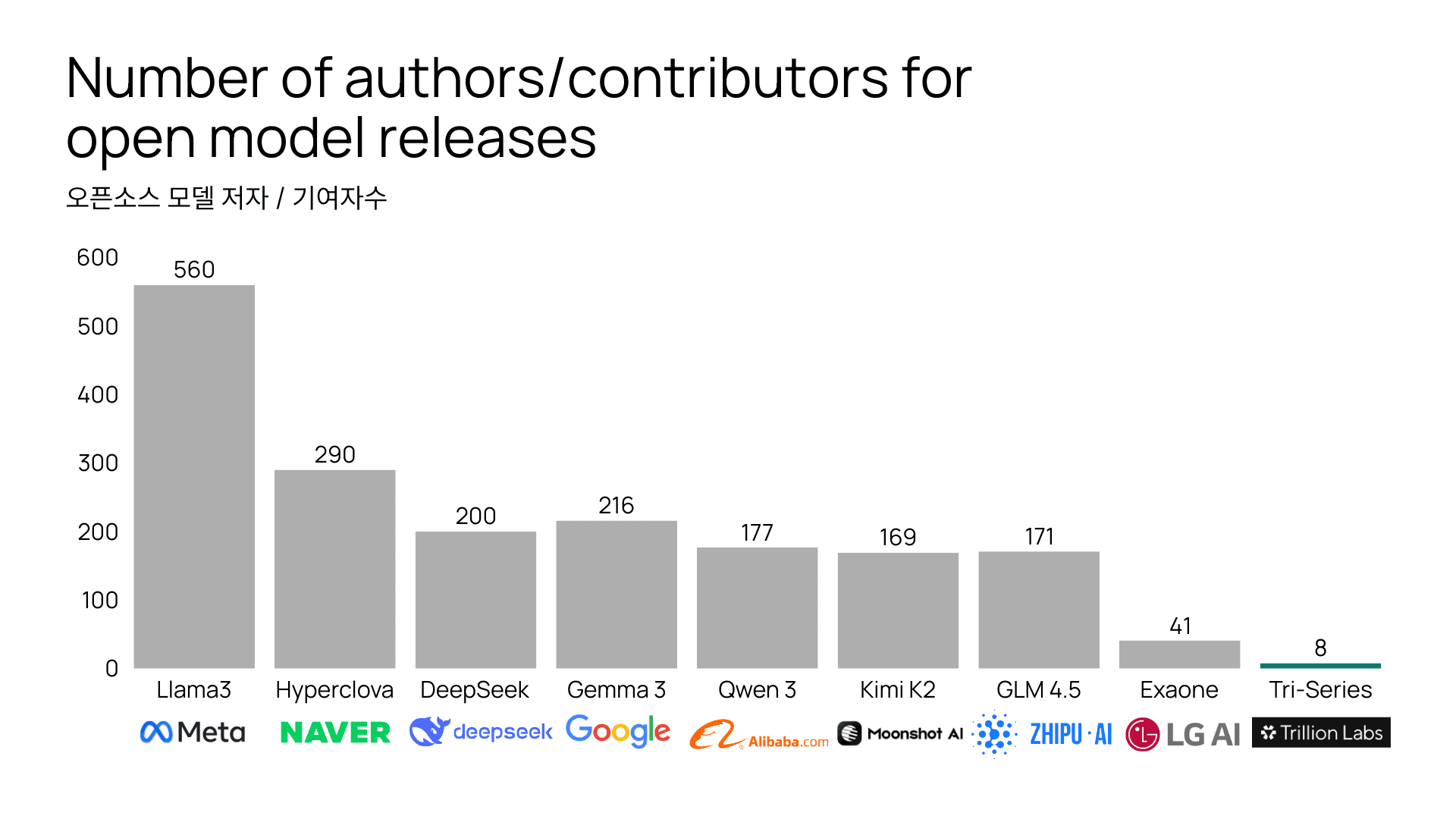 수백 명이 투입되고, 수천억 원의 비용이 들어간 LLM들이 매일같이 쏟아지고 있는 지금, Trillion Labs는 단 8명의 개발자만으로 7B, 21B, 그리고 70B에 이르는 국내 최대 규모의 LLM 시리즈, Tri-Series를 직접 설계하고 학습해 오픈소스로 공개했습니다. 중국산 LLM을 파인튜닝한 것도, 기존 오픈소스를 복제한 것도 아닙니다.